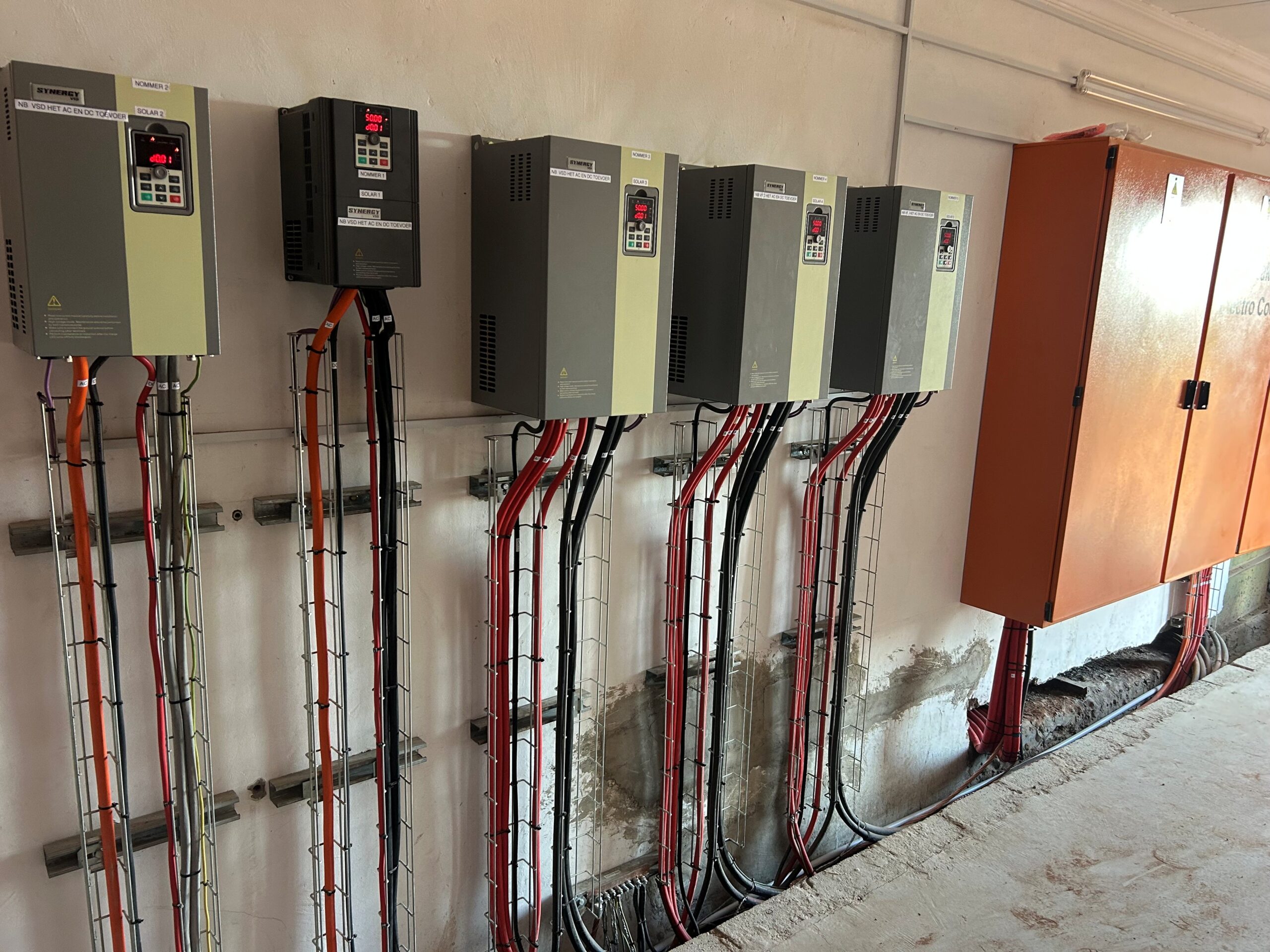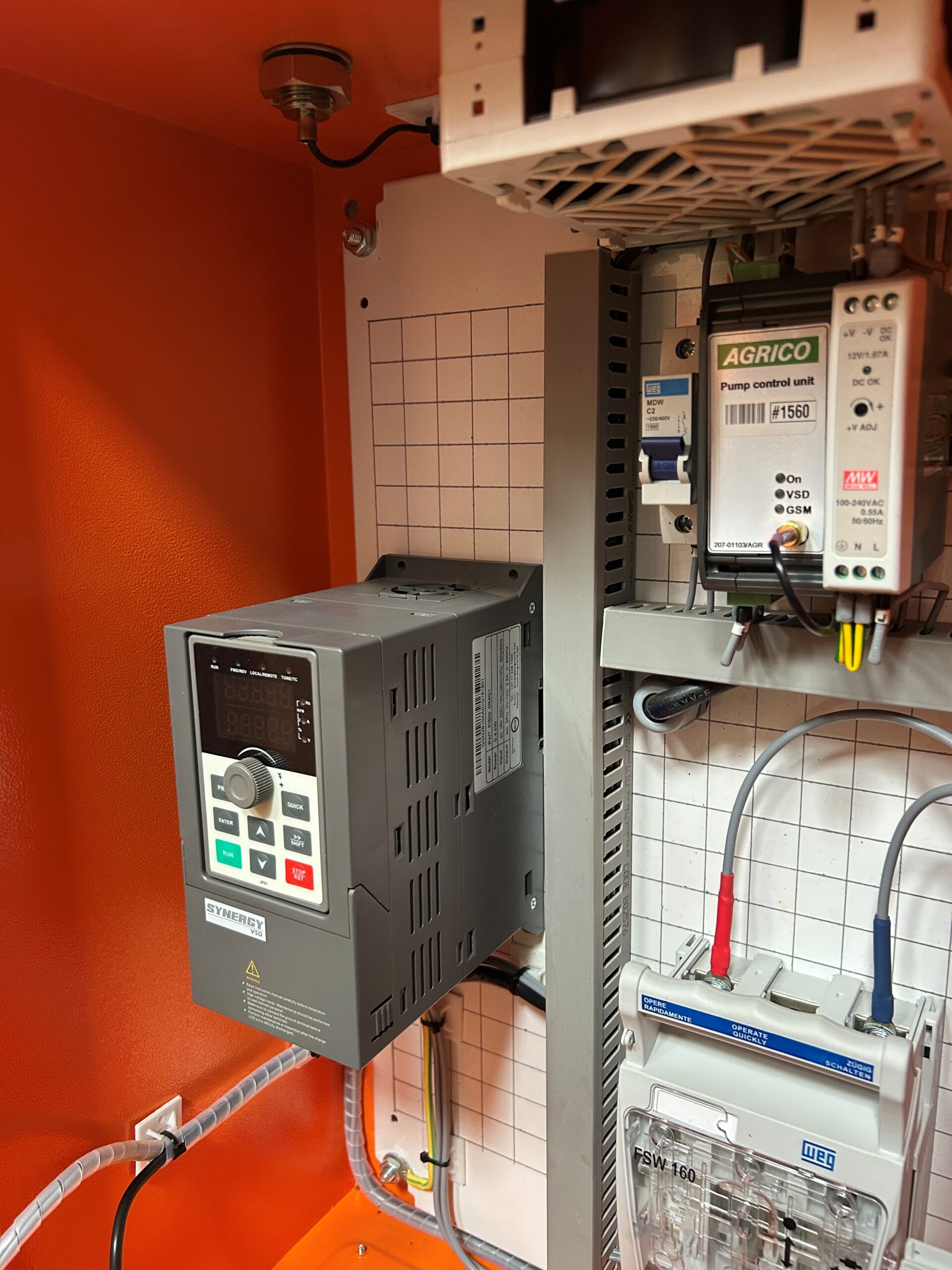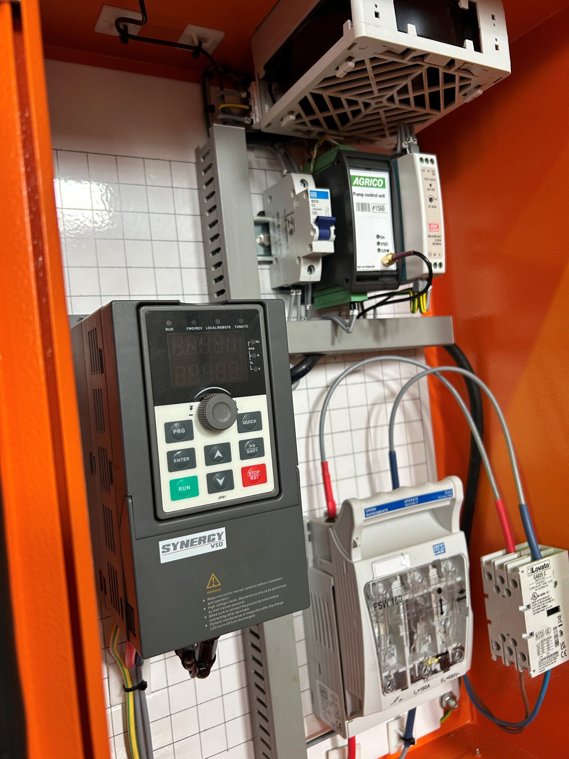 The Synergy PI500 inverter features robust hardware with wide input-voltage tolerance, a protective coating against dust and moisture and advanced cooling for extended service life. Safety and reliability are reinforced through EMC compliance, with built-in protection against over-voltage, under-voltage, over-current and overheating. Peripheral options include braking units, reactors and PLC function cards, while communication is handled via RS485 and Modbus RTU for smooth integration with Agrico controllers. The Synergy PI500 VSD series also supports full Hybrid AC and DC voltage supply (Solar and Eskom), when installed within a BMG hybrid enclosure. This enclosure boasts advanced cooling functions and DC to AC interference mitigation.