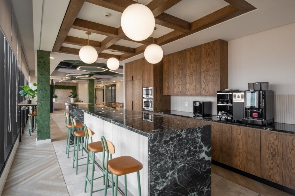 Material selection plays a defining role in the workspace, supporting both performance and visual cohesion. A porcelain slab is used consistently across joinery surfaces, creating a unifying thread that links different areas and reinforces a sense of continuity.