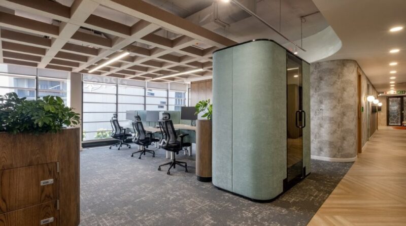 The layout reflects a shift toward activity-based hybrid working, aligning with broader global trends in workplace design. Open-plan workstations are balanced with enclosed meeting rooms, acoustic call pods, touchdown areas, and social spaces to support a range of work modes.